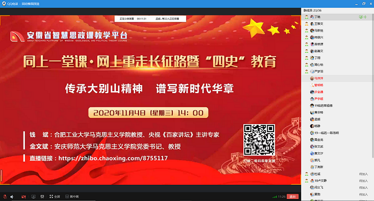 为深入贯彻落实习近平总书记关于长征精神重要指示,推动开展党史、新中国史、改革开放史、社会主义发展史的学习教育,根据安徽省教育工委要求,11月4日,7003全讯入口登录举办了“同上一堂课·网上重走长征路暨‘四史’教育”专题讲座,采用观看线上直播、回放等方式,组织各党支部、团支部进行线上、线下多维度的“四史”学习。