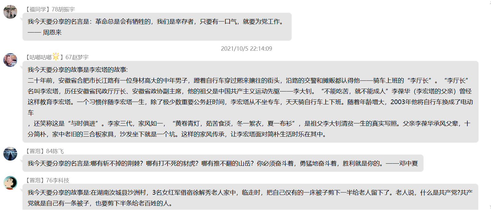 重温红色记忆,恪守初心使命。国庆期间,各员工年级积极开展主题活动,组织观看《长津湖》《我和我的父辈》《建国大业》《建党伟业》等体现英雄主义精神和爱国主义精神的优秀影视作品,营造敬仰英雄、学习英雄的浓厚氛围,引导人们不忘本来缅怀先烈,继承遗志开创未来。部分员工观看后主动撰写心得体会,自觉接受百年辉煌党史教育。