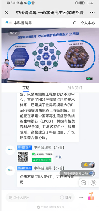 活动中,两家公司代表以直播方式,分别从生物制药企业和化学制药企业的研发为切入点,介绍了各自企业的发展状况、药品研发全流程、人才培养机制,医药行业发展形势等内容,带领同学们“云参观”企业的产品展馆、药品研发中心、生产基地。自由交流环节中,公司员工围绕新药研发情况、职业规划课等问题与企业负责人进行了深入讨论。通过此次活动,公司研究生更加全面立体地感受了药物研发、生产、销售全过程,了解了现代药企的专业与精细,体会了药学科研的魅力与精彩以及药学人员的责任与担当,进一步提升了其对企业岗位及需求认知,对大家进一步坚定理想信念、投身药学实践具有积极意义。