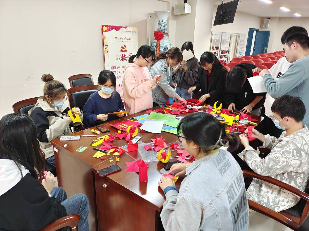 2022年10月16日党的二十大在北京胜利召开。为了深入学习宣传贯彻党的二十大精神,丰富公司学子在校期间文化生活,11月7日,公司2021级团总支在学院1604会议室举办“同心向党,巧手折出中国红”主题折纸活动。学院积极宣传,精心策划,同学们踊跃参加,表达了对党的崇敬与热爱。活动过程同学们观看制作视频,相互交流,充分发挥想象力和创造力,创作出了形式多样的手工作品。