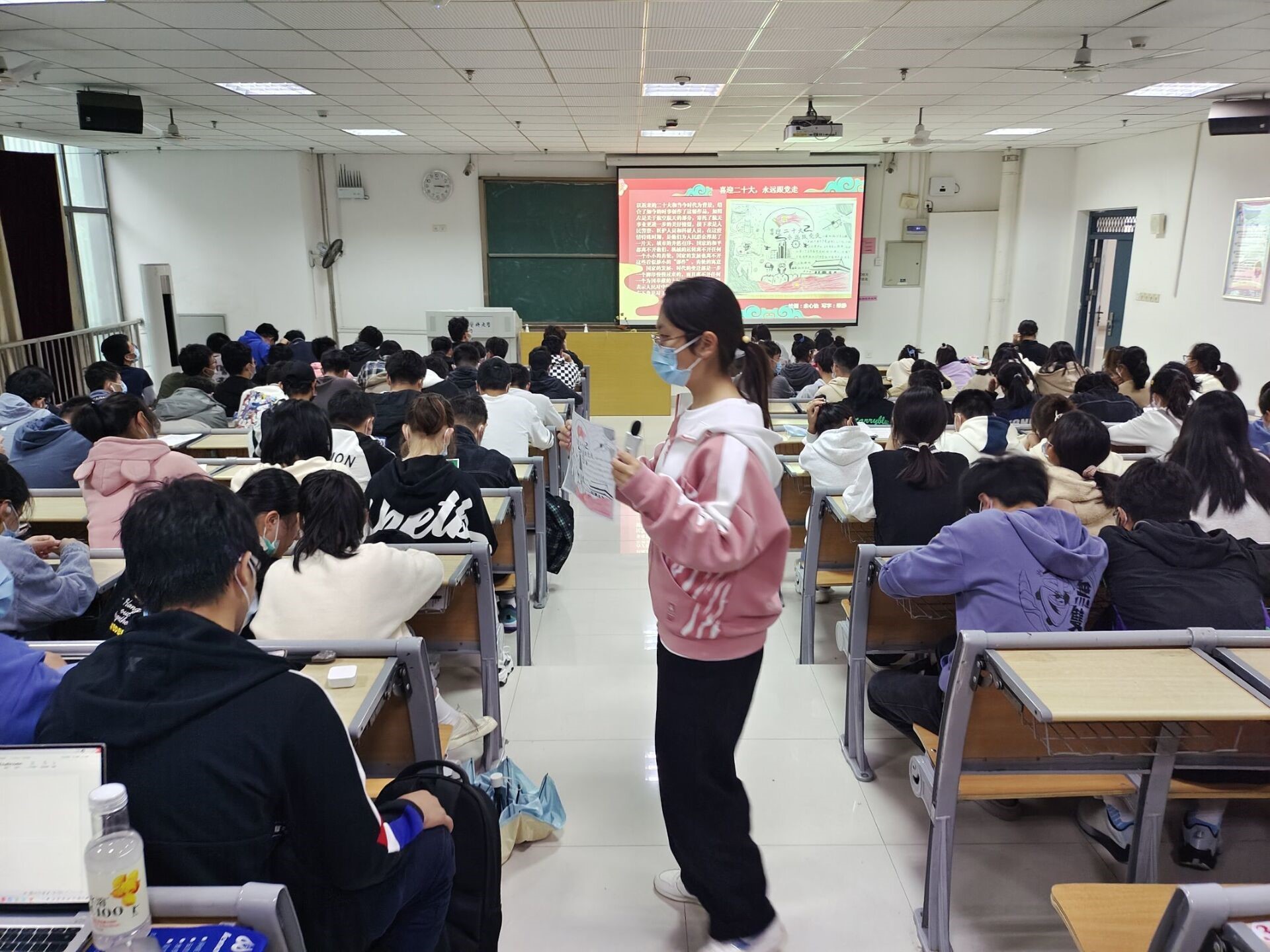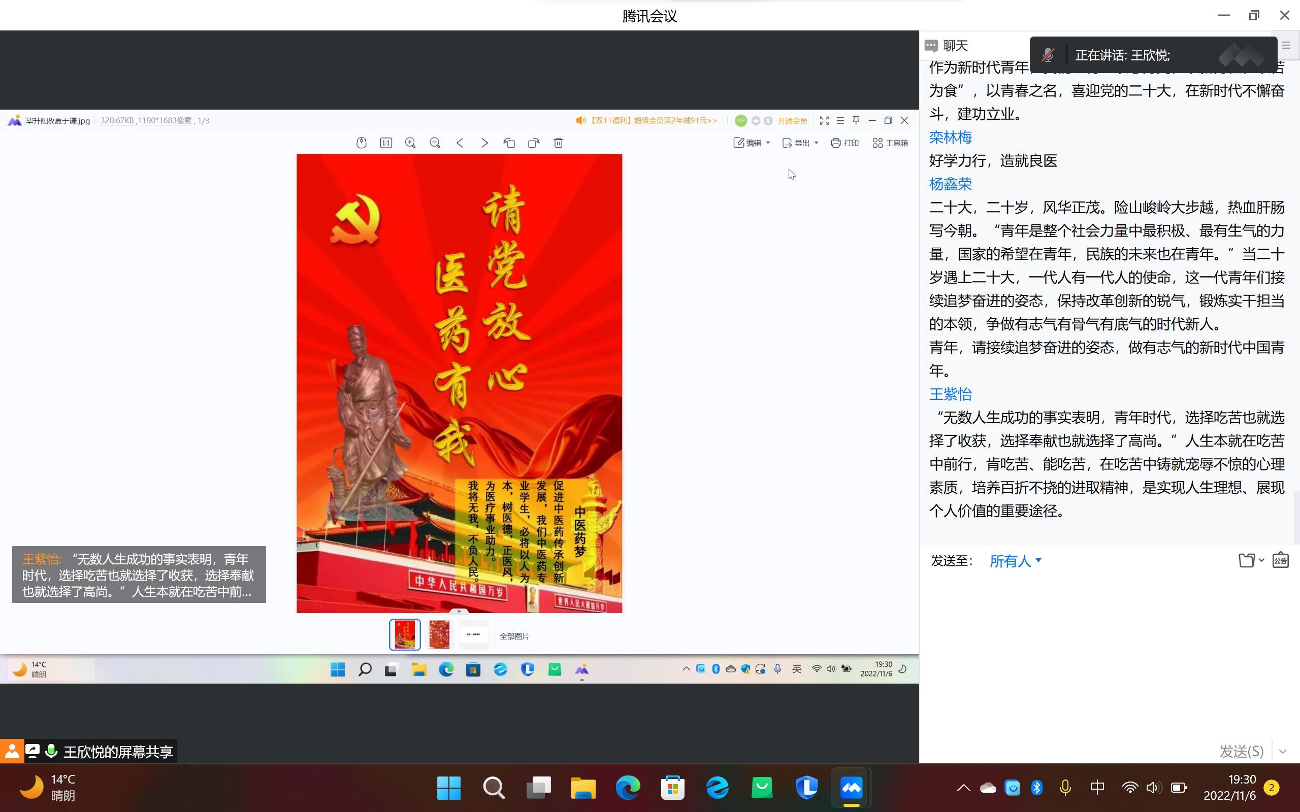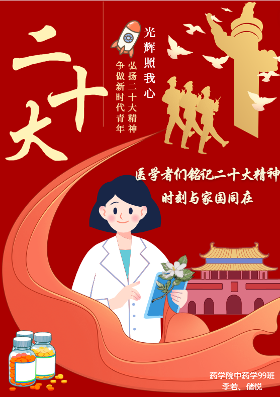 11月6日下午,“学习二十大精神,争做新时代青年”海报设计大赛顺利开展。为激发员工爱党、爱国热情,辅导员带领全体成员重温入团誓词,齐唱团歌,参赛人员有序解说海报的设计寓意,表达了药学学子心怀医学使命,肩负济世之任的责任和担当,彰显了青年员工接力奋斗的志气、实干笃行的骨气和报效祖国的底气。