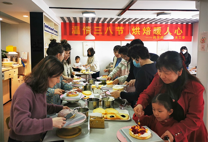 活动邀请烘焙老师给大家讲解烘焙食材搭配、演示制作步骤。在老师的指导下,走下讲台、走出实验室的女教师们化身甜点大师,夹馅、抹奶油、裱花、点缀水果,每一份蛋糕都是展示生活情趣的艺术品。活动现场弥漫着快乐和幸福的味道。