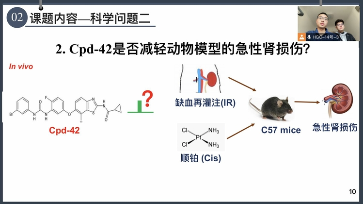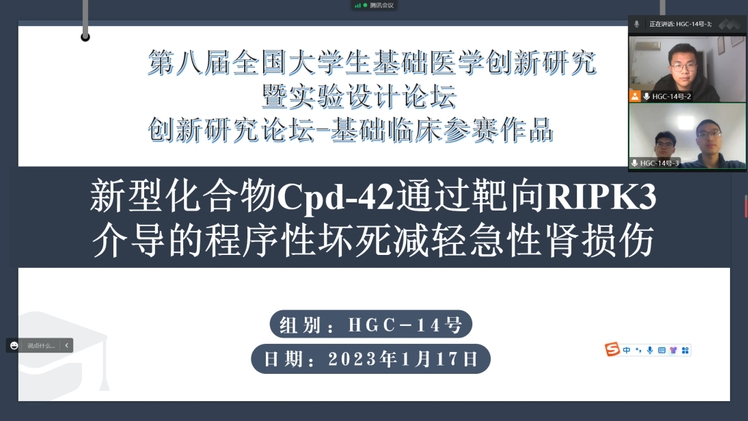 该项目经过多轮汇报与选拔,于创新研究赛道从校赛到东部赛区复赛均获佳绩,最终顺利进入全国总决赛终审环节。这一项目创新性地探讨了一种代号为Cpd-42的新型化合物对顺铂和缺血再灌注引起的急性肾损伤的保护作用及其可能机制,发现该化合物能通过抑制RIPK3介导的程序性坏死通路有效预防和治疗急性肾损伤,提示其可能成为治疗急性肾损伤的潜在临床药物并论证了RIPK3作为急性肾损伤治疗的潜在靶点的可行性。